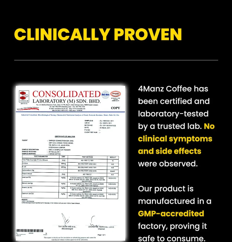Note that the ingredients in Power Coffee 4manz, including 100% premium Arabica coffee, Korean Ginseng, Cordyceps Roots, and Wild Lingzhi, have been tested by renowned laboratories and are safe to drink anytime.