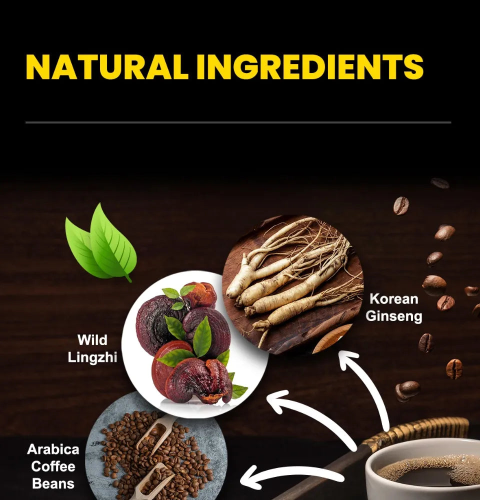 - A premium blend of 100% Arabica coffee and natural ingredients: Korean Ginseng, Cordyceps Roots, and Wild Lingzhi.